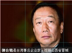 郭台铭是台湾著名企业家,祖籍山西省晋城市泽州县南岭乡葛万村(郭氏为明洪武年间洪洞大槐树迁入),出生于台北县板桥市,台湾第一大企业鸿海精密(下属华人最大科技集团富士康科技集团)创办人。他多年名列富比士亿万富翁列表中。2013年3月,富比士公布全球富豪排行榜,郭台铭以51亿美元,排名台湾第3